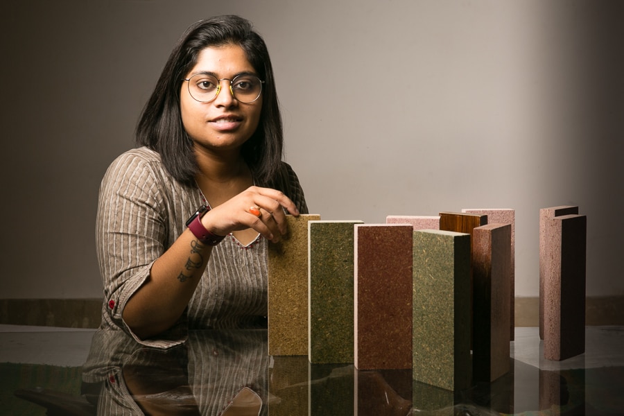 Shriti Pandey, founder, Strawcture Eco with the agri bio panels Image: Madhu Kapparath[br]