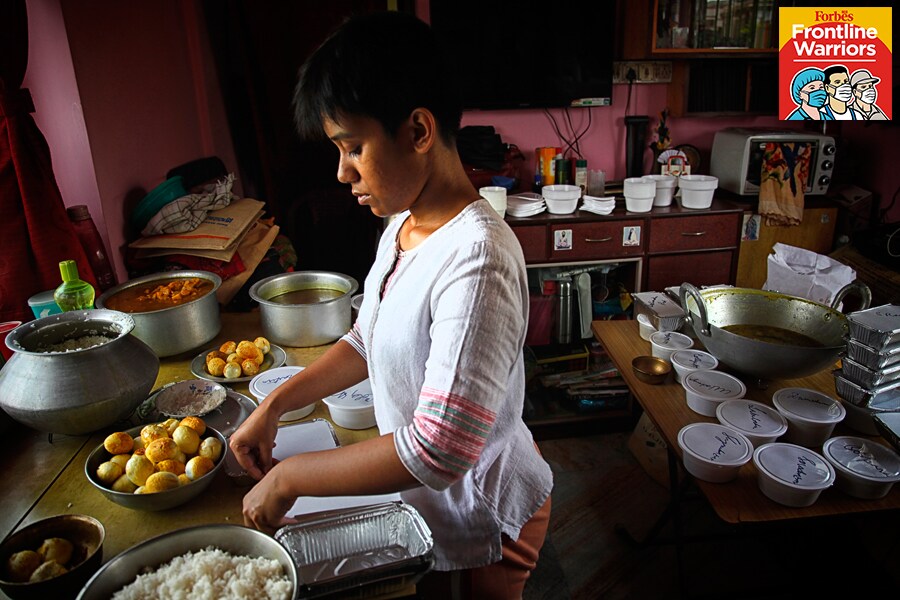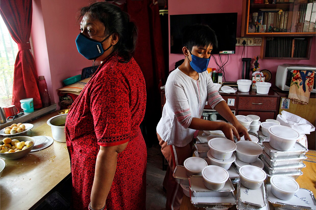 Srabasti Ghosh packs food for Covid-affected people, at her home in North Kolkata’s Bagbazar area. She sends home-cooked food to 50 to 60 families