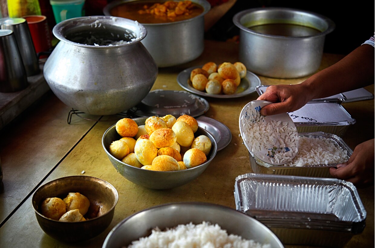 The meal consists of rice/rotis, dal, vegetable and egg or fish curry