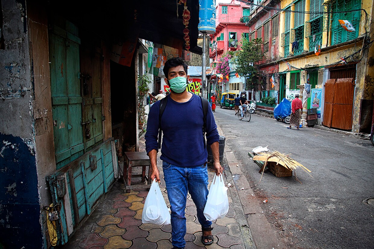 A Covid-affected person in Kumartuli area of North Kolkata is glad to see Dutta arrive with a packet of food