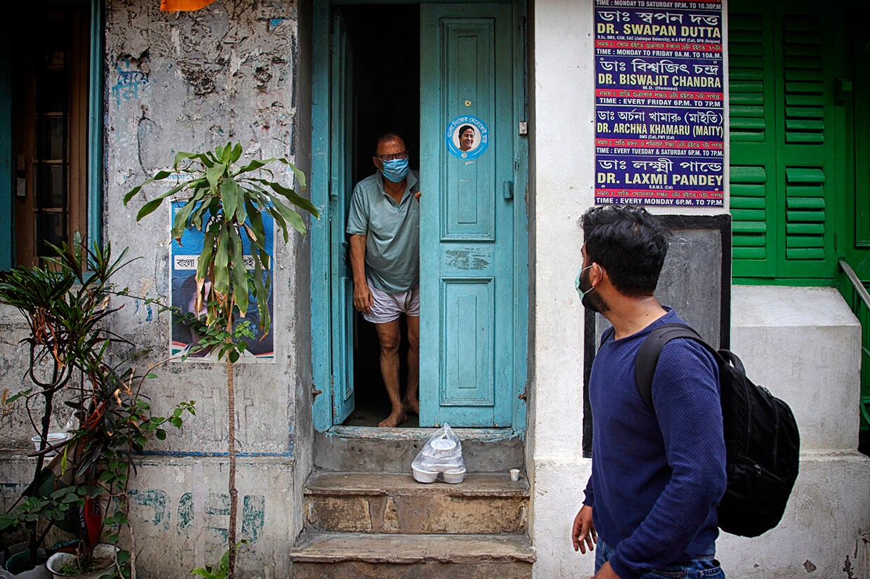 A Covid-19-affected man picks up his parcel and thanks Dutta