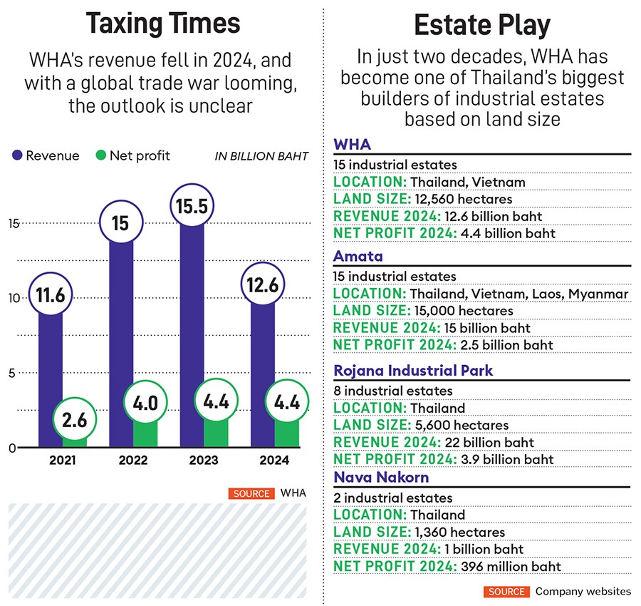 To bankroll the group’s plans, Jareeporn was looking to raise funds by listing the industrial estate business but postponed the IPO in March, citing market volatility even before the tariff hit. Now she says she will draw upon internal cash flow and take on debt. “We still have a very strong financial position," she says, adding that even with increased borrowing, she’s confident of containing WHA’s net gearing ratio well below its 2.5 covenant.