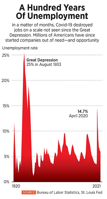 The pandemic has already spawned more than 4 million new businesses. For their founders, there’s no going back. “We could see a revival of society and economy just as the Roaring ’20s unfolded after the first World War and the 1918 flu," says Dan Wang, an associate professor of business at Columbia University. “It’s not a stretch to suggest that we will see an explosion of new ideas coming from these new ventures."