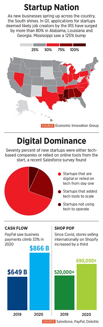 Shopify, the $150 billion (market cap) software company that lets small businesses sell online, saw a near-80 percent increase in new stores in 2020. Digital-payments giant PayPal had a 40 percent rise in business accounts over the same period. According to a Salesforce survey, a whopping 70 percent of new startups are either technology companies or digital-first from day one. Meanwhile, a host of online lenders are giving a wide range of founders more options to borrow cash. In 2020, business-loan marketplace Lendio fulfilled more than 100,000 non-PPP small-business loans—a 500 percent increase from the previous year.