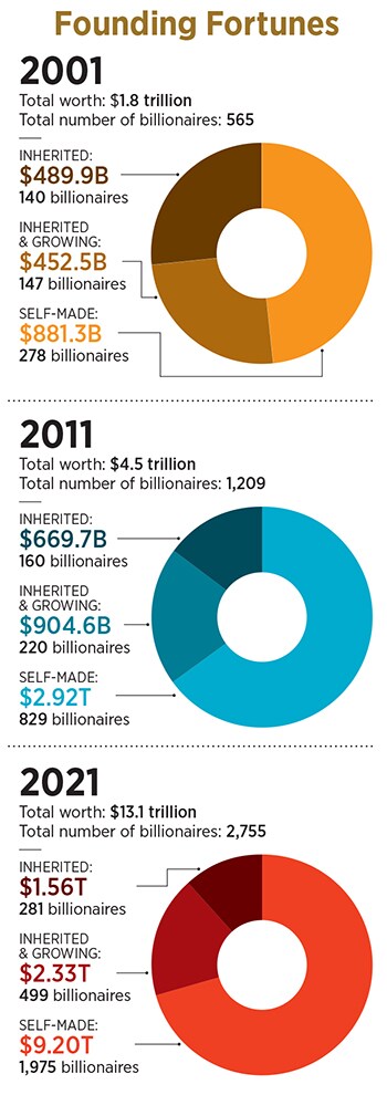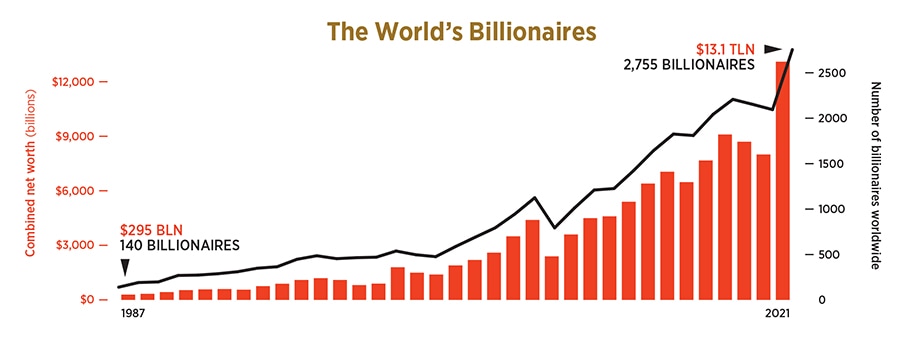 One year after that fortuitously timed snapshot, we repeated our March billionaires audit, taking the measure, at the point of the pyramid, of the past year’s seismic changes. The results defy hyperbole. Over the past 12 months, 493 people worldwide joined the Forbes list—a newly minted billionaire every 17 hours. Rising asset prices vaulted another 250 previous drop-offs back over the ten-digit mark. Amid widespread economic insecurity, precious few billionaires fared worse financially: Just 61 dropped off the list for reasons other than death, representing the lowest percentage of drop-offs for any year on record. All told, Forbes estimates that there are now 2,755 billionaires globally, up from 2,095 last year, and the notion that the rich get richer has never been more apt: They’re worth, in aggregate, $13.1 trillion—a staggering $5.1 trillion more than at the start of the pandemic.