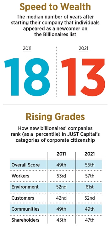 How do these more meritocratic, more dynamic, more diverse billionaires run their companies? In ways that are better for all of us. Forbes contracted with our partners at JUST Capital, which measures corporate citizenship, to gauge the civic performance of the 88 new self-made US billionaires. We took the companies that drove each billion-dollar fortune and, leaning on industry averages, calculated each score based on how they treat their workers, their customers and the environment, among other factors. The net result: Not only did these new billionaires found or run companies that rank above average in terms of the three factors mentioned above, but they’ve also improved in each of these categories when measured against the new billionaires of 10 years ago.