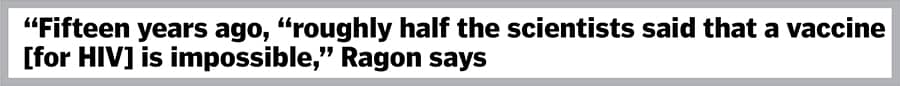 Fifteen years ago “roughly half the scientists said that a vaccine is impossible," Ragon says. Will there be an HIV cure in his lifetime? He doesn’t miss a beat: “Yes."