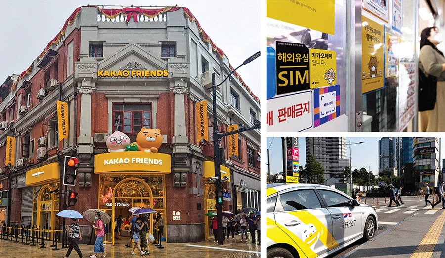 (Clockwise from left) A Kakao Friends store selling character merchandise such as Ryan (the lion) and the radish-in-rabbit clothing Muzi Kakao Pay is accepted at stores throughout South Korea a taxi operated by Korea MobilityImage: Kakao friends, Getty Images Bloombergv