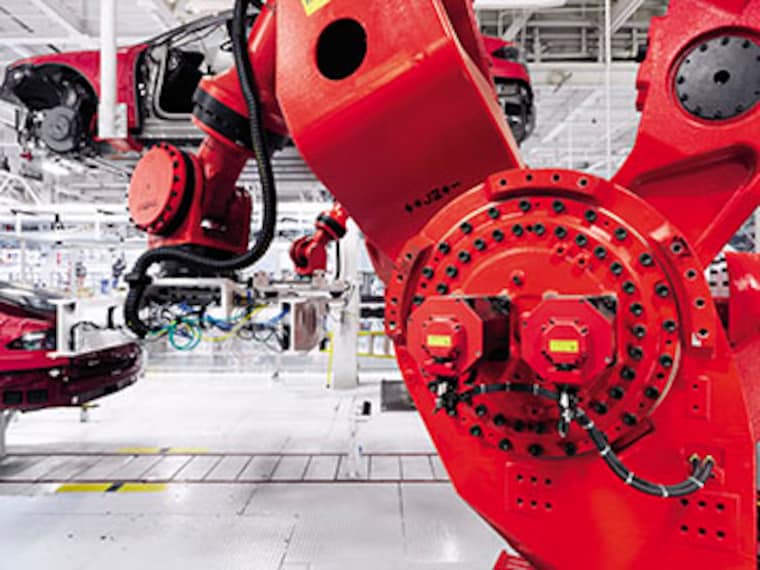 The first thing you notice when you step onto Tesla Motors’s production floor are the robots. Eight-foot-tall bright-red bots that look like Transformers, huddling over each Model S sedan as it makes its way through the factory in Fremont, California, on the eastern, shaggier side of Silicon Valley. Up to eight robots at a time work on a single Model S in a choreographed routine, each performing up to five tasks: Welding, riveting, gripping and moving materials, bending metal, and installing components. Henry Ford and the generations of auto industry experts who have followed would dismiss this set-up as inefficient—each robot should do one task only before moving the car on to the next Transformer.