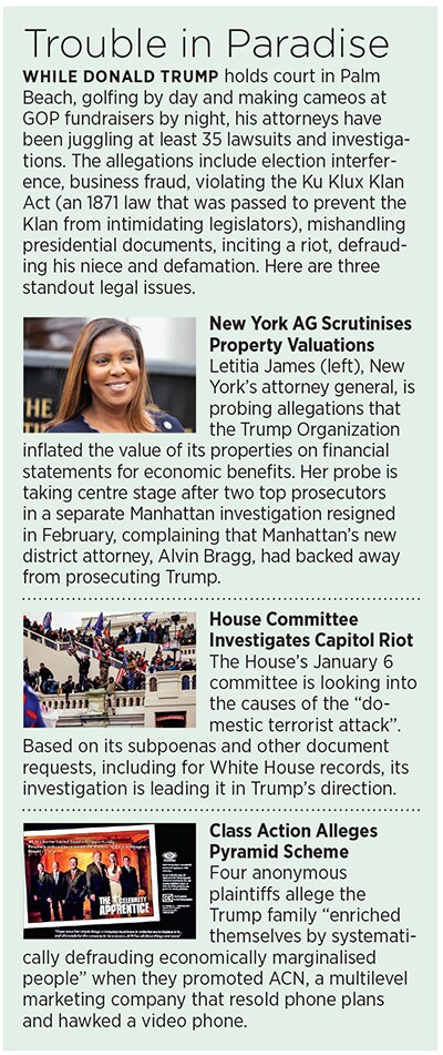 Banned from Twitter, the former president announced in October that he was creating his own social media platform, Truth Social, through the Trump Media and Technology Group, which uses Mar-a-Lago as its address. The app became available in February and has since been downloaded an estimated 1.5 million times, but 1.3 million potential users are on a waitlist. Trump has posted only once: “Get Ready. Your favorite president will be here soon." Investors don’t seem to care. Trump Media plans to merge with a SPAC that retail traders are buying like crazy, boosting its shares from $10 to more than $70. Based on clues buried in regulatory filings, Trump probably owns at least 50 percent. We estimated the value of the shares Trump should eventually receive at $10 apiece, reflecting the discounted rate that a handful of smart-money investors recently agreed to pay to jump into the frenzy.