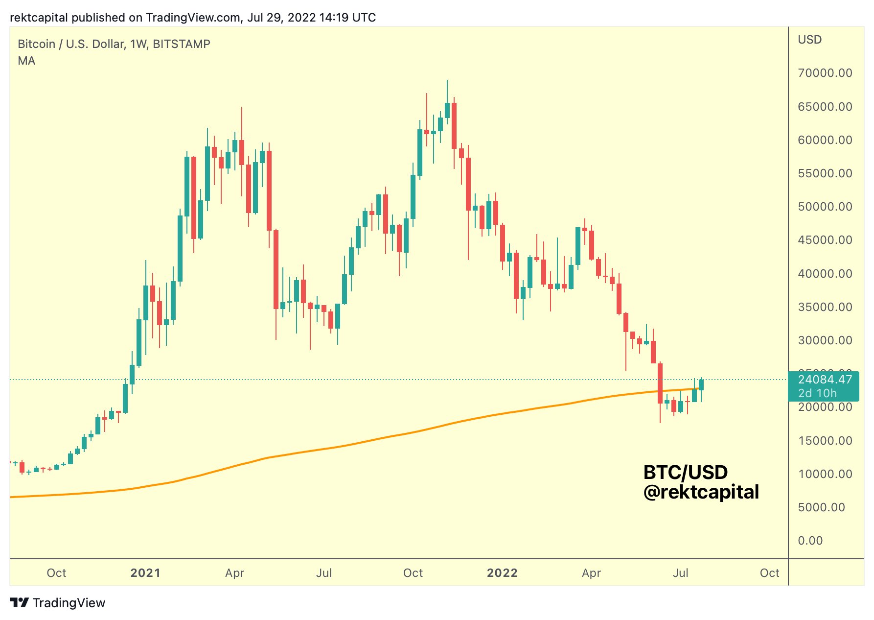 Other analysts concentrated on the importance of the present spot price levels, which were above the important $22,800 200-week moving average (MA). The first for Bitcoin since June, BTC would be closing the week above that trendline.