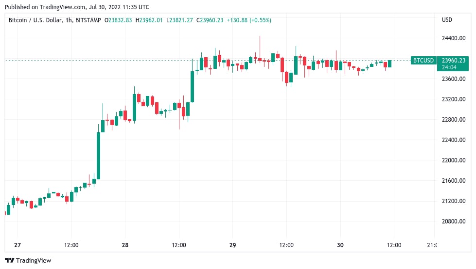 Recent data from Cointelegraph Markets Pro and TradingView indicates that Bitcoin (BTC) may continue to face resistance at $24,000 all through July 30. In the second half of the week, risk assets experienced spurts owing to favourable macro events that benefited the pair BTC/USD. The US stocks also experienced some pleasure runs during the July uptrend.