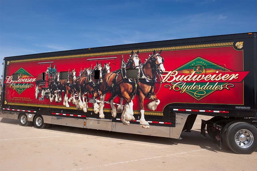 The Budweiser Clydesdales are a popular group of horses Budweiser uses for promos and commercials. The beer company is a major sponsor of horse racing events that happen worldwide.