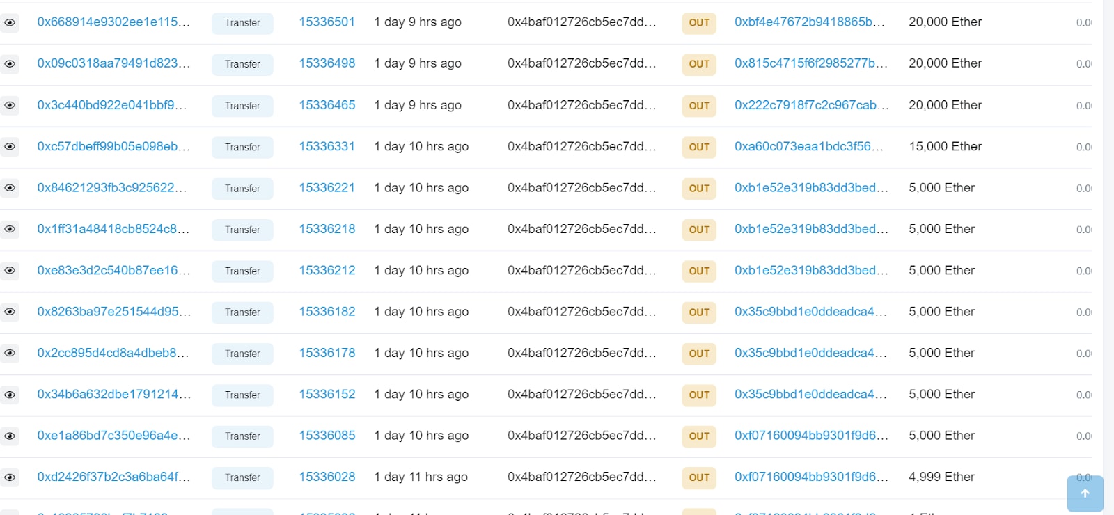 When Ethereum’s price spiked to $2,000, the whale wallet transferred 145,000 ETH to multiple wallet addresses. The transfers were done in several batches of 5,000 ETH, with some transfers going over 10,000 ETH, too. The total value of these transferred Ether tokens was around $280 million. The whale wallet now has a balance of 0.107 ETH left.