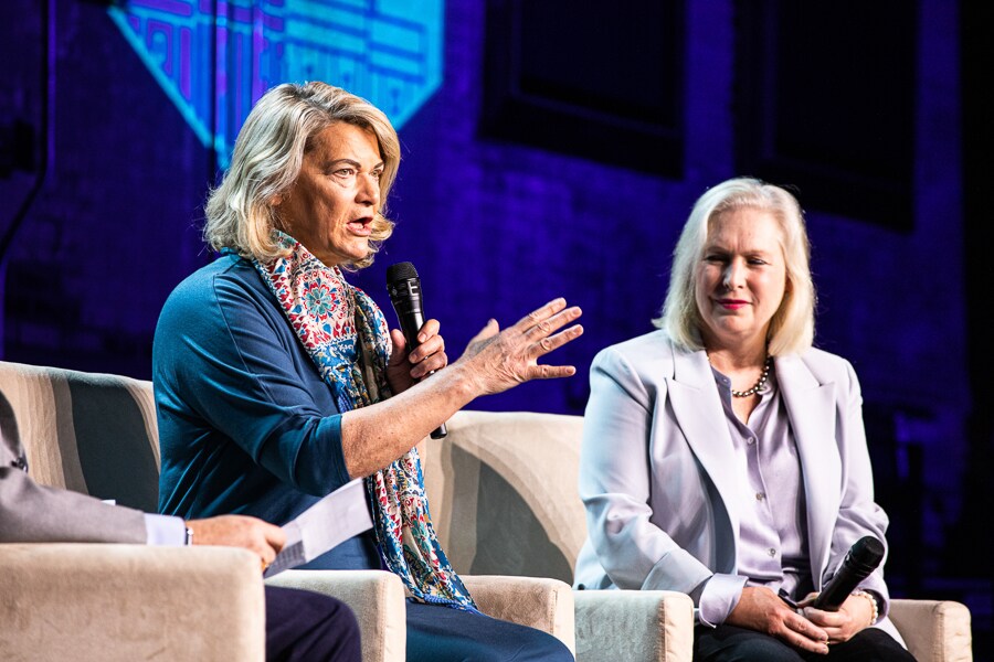 Senator Cynthia Lummis, a Republican from Wyoming (left), and Senator Kirsten Gillibrand, a Democrat from New York, onstage during the DC Blockchain Summit in Washington, D.C., US, on Tuesday, May 24, 2022. The summit is gathering the most influential people focused on public policy for digital asset and blockchain innovations, according to the organizersImage: Valerie Pleasch/Bloomberg via Getty Images[br]