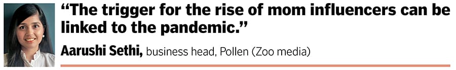 “The trigger for the rise of mom influencers can be linked to the pandemic. With children at home due to lockdowns, moms consulted other mothers since they had to get creative with activities their kids engaged in. They also sought recommendations on recipes and practical tips on topics like meal ordering and managing activities during school hours," says Aarushi Sethi, business head, Pollen (Zoo media).