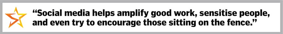 Social media, Vani says, helps “amplify good work, sensitise people, and even try to encourage those sitting on the fence to jump on the side of doing good work and taking responsibility".