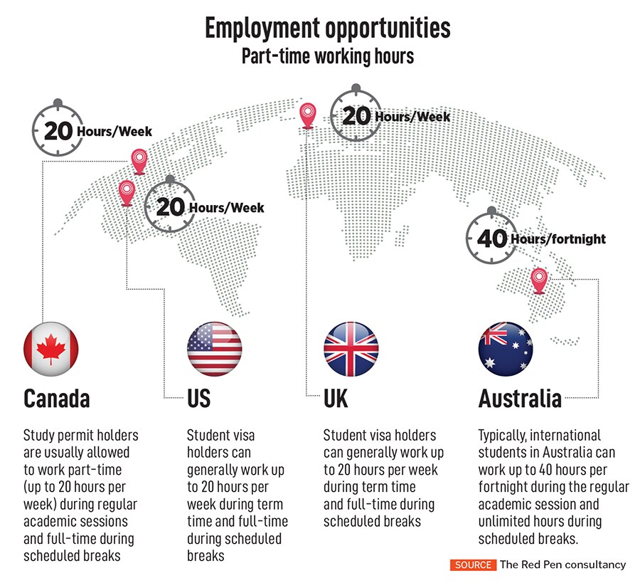 International students often have the opportunity to work part-time during their studies, typically limited to 20 hours per week during term time, with the possibility of full-time employment during holidays, subject to visa regulations. In the US, students on an F1 visa can apply for Optional Practical Training (OPT) to work in their field of study for up to 12 months after graduation, with extensions available for certain STEM fields. The UK offers a two-year post-study work visa under the Graduate Route, allowing students to seek employment or work experience after completing their studies. Australia’s post-study work visa allows graduates from Australian universities to work for 2-4 years, depending on their qualification level. In Canada, the Post-Graduation Work Permit Program (PGWPP) allows students who have completed a programme at a Canadian post-secondary institution to obtain an open work permit and gain valuable Canadian work experience. France offers a post-study work visa that permits non-EU students to stay and work for a year after graduation to seek employment related to their field of study. Other important points:
