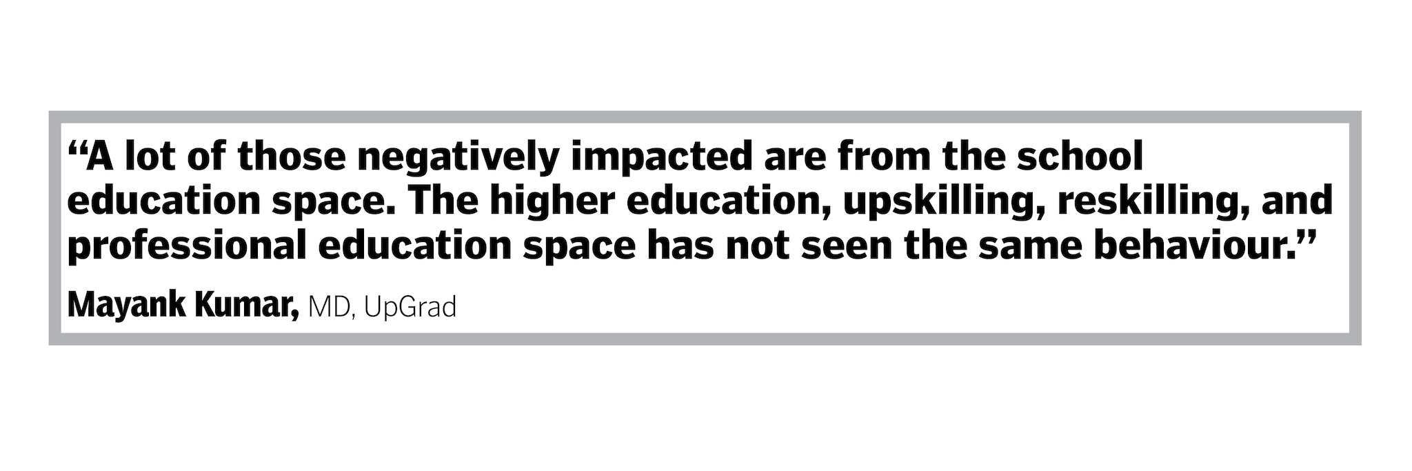 “One needs to be cognizant that a lot of those negatively impacted are from the school education space," says Mayank Kumar, managing director of Indian edtech unicorn company UpGrad. “The higher education, upskilling, reskilling, and the lifelong learning adult or professional education space that has not seen the same kind of behaviour."