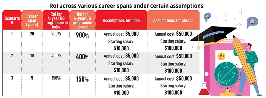 The RoI from higher education hinges on several critical factors, including cost, earnings potential, career span and strategic educational choices. Opting for government-funded institutions in India or leveraging scholarships and in-demand skills abroad can yield a higher RoI. However, the financial risk of studying abroad on loan warrants careful consideration of postgraduation employment prospects. Students and their families may use the above methodology to closely evaluate their choices to make informed decisions that maximise their RoI. It may be noted that the above calculations are based on averages and assumptions, which can vary widely. It also does not take into account some of the non-financial benefits into account such as personal development, networking, range of career options, work-life balance etc.