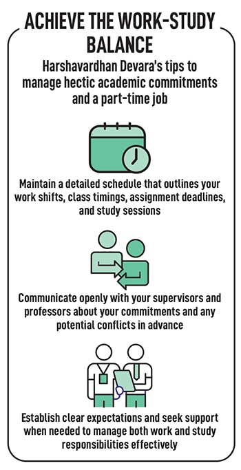 Devara emphasises that relying solely on part-time work to cover university fees is unrealistic. While the income from part-time jobs can alleviate financial burdens to an extent, it’s often insufficient to fully fund tuition fees in the US. “In my personal experience, the earnings from my part-time job primarily support my day-to-day living expenses, such as accommodation, groceries, transportation and other essentials. However, the substantial cost of tuition fees is predominantly covered through educational loans or other forms of financial aid," he says.