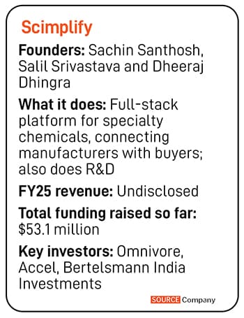 Born out of that simple question was Scimplify, a Bengaluru-based specialty chemicals platform that Santhosh co-founded with Salil Srivastava and Dheeraj Dhingra in September 2023. “There were plenty of underutilised factories in India,” Santhosh says. “The problem wasn’t supply, it was trust and scalability.”