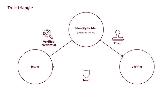 The first building block of digital identity is the trust triangle connecting three stakeholders: the identity holder, the issuer, and the verifier. Using the diagram from Bankenverband, below, we can visualise the concept better.