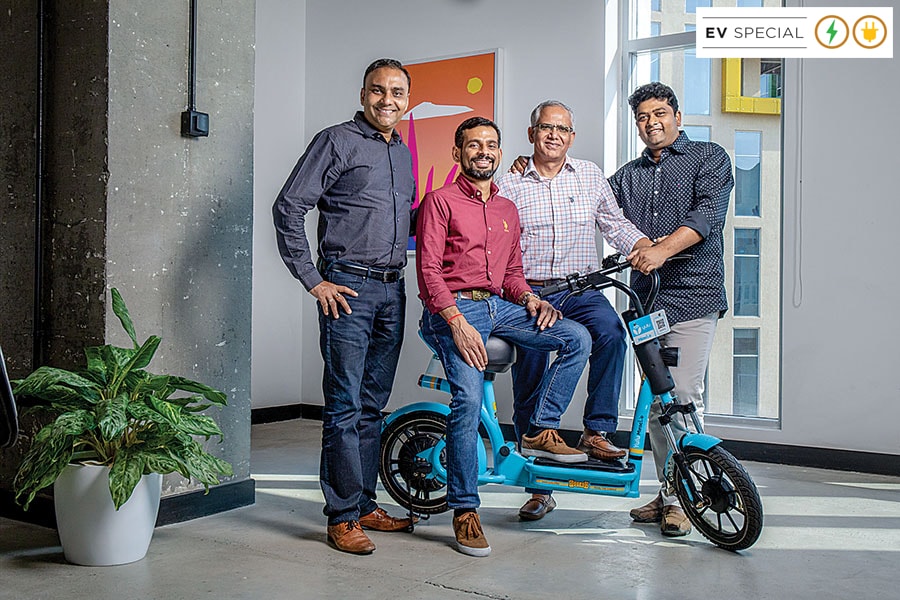 (From left) Amit Gupta, Hemant Gupta, RK Misra and Naveen Dachuri, the cofounders of Yulu Bikes, Bengaluru