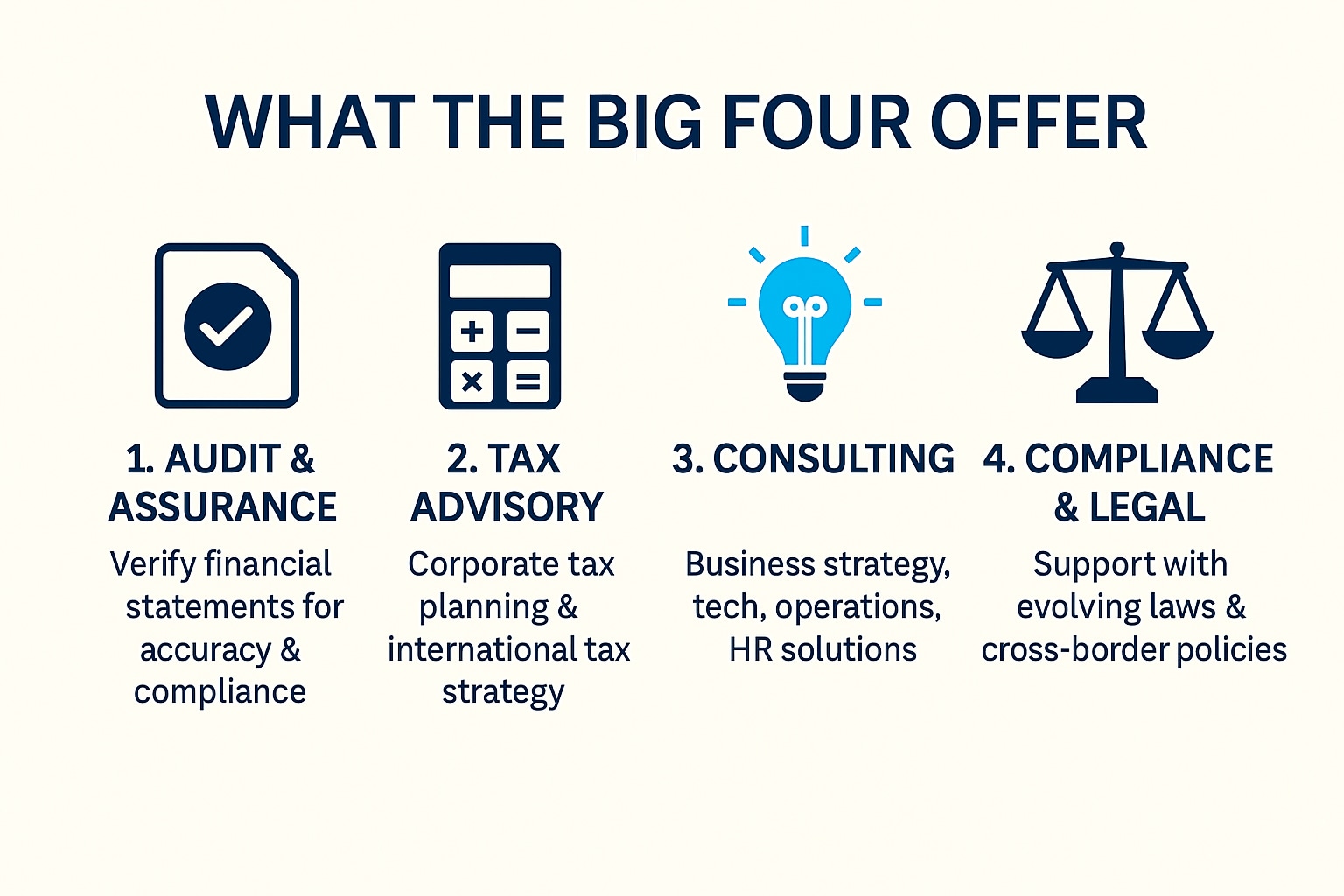 The Big Four companies offer multiple professional services across various industries, including AI, supply chain management, sustainability, and more.