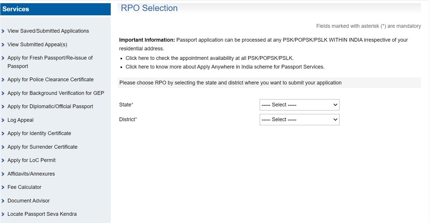 Select the Passport Seva Kendra (PSK) of your choice on the ‘Pay and Schedule Appointment’ page.