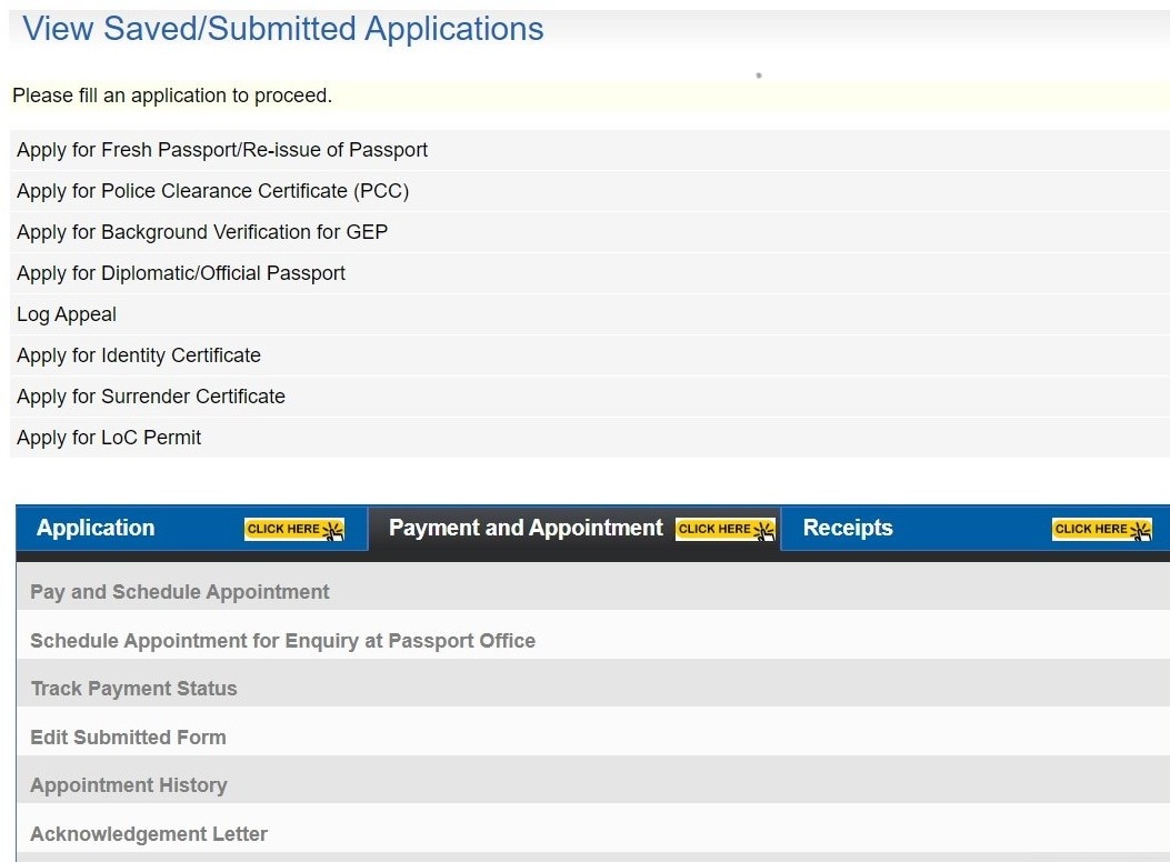 Choose ‘View Saved and Submitted Application’ and then the ‘Pay and Schedule Appointment’ option from the ‘Payment and Appointment’ tab.