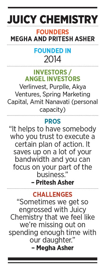 However, there is no work-life balance. “As entrepreneurs, we anyway take business personally and then as a couple, it only gets harder," says Singh of Sugar Cosmetics. It’s harder when you have children. Asher of Juicy Chemistry feels that sometimes they get so engrossed with work that there is a feeling of missing out and not spending enough time with the kids.