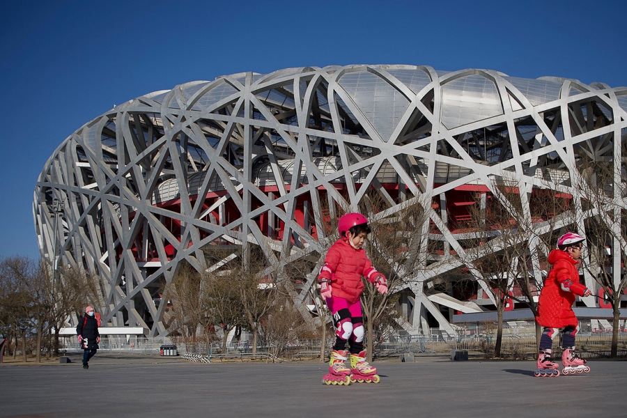 Children skating past the Bird"s Nest stadium, the venue for opening and closing ceremonies for the 2022 Winter Olympics, in Beijing