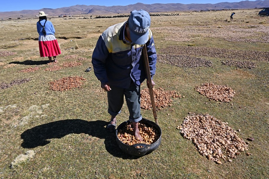 Chuno is cultivated in June and July, during the southern hemisphere winter when temperatures drop low enough— -5 degrees Celsius (23 Fahrenheit)—for the potatoes to freeze in the open air.