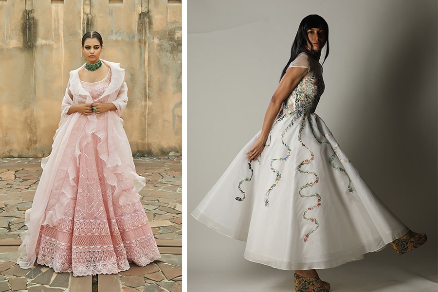 (L) Bani Thani–Bridal Heirlooms from Jade is inspired by Rajasthani minitature painitings. (R) Samant Chauhan"s collection is characterised by abstract forms, symmetry and embroidery.