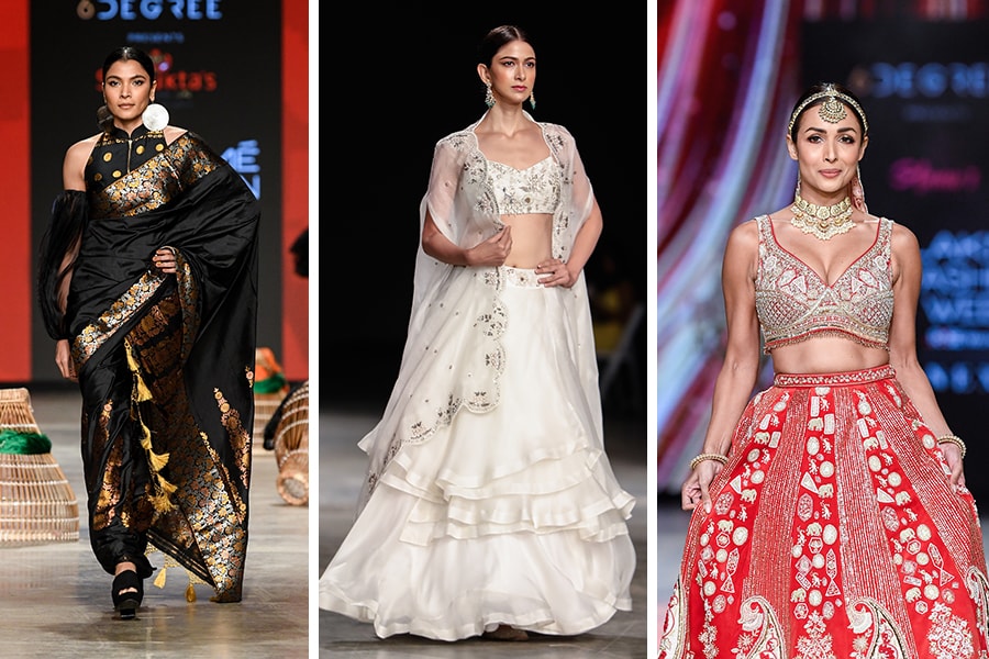(L) Sanjukta Dutta"s all-black ensembles with colourful weaves were made from silk from Assam. (M) Shikha and Shrishti"s show opened with a gorgeous white embroidered gown, followed by tiered, layered skirt with a kurti, a delicately embroidered white lehenga, choli and dupatta trio. (R) Showstopper Malaika Arora wore an ornate choli, red lehenga with lavish paisley embroidery and a red tulle dupatta for Annu Patel"s show.