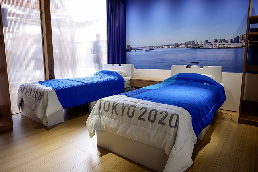 Beds are made from recyclable cardboard, but are tough enough to stand up to beefy weightlifters and towering basketball players, organisers say.