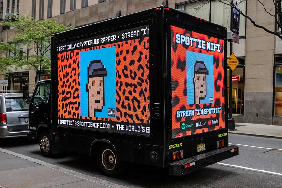 A truck parked outside of Christie"s auction house displays a CryptoPunk digital art non-fungible token (NFT) on electronic billboards in New York City.