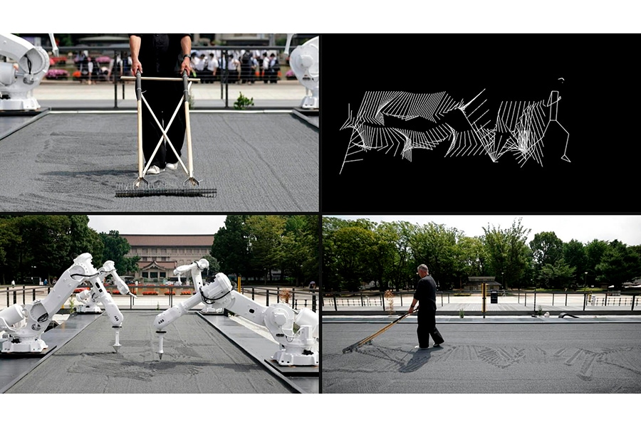 At a serene zen garden in a Tokyo park, abstract lines inspired by the movements of Olympic athletes are carefully traced in the gravel— not by monks, but by robots.