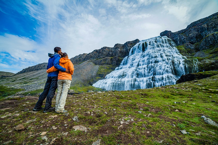 Couple of tourists near Dynjandi is the most famous and beautiful waterfall of the West Fjords in Iceland
