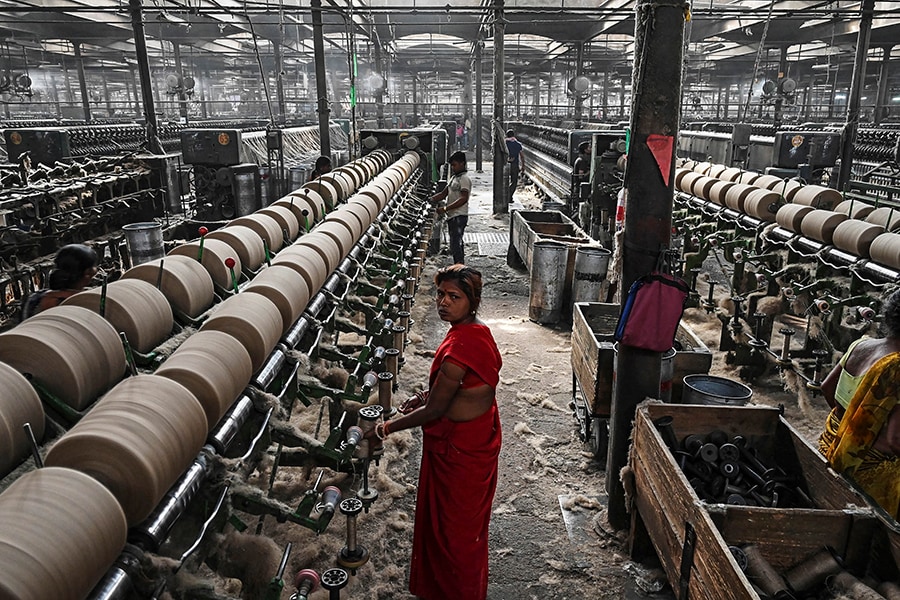 Labourers work at a private jute mill in Jagatdal.