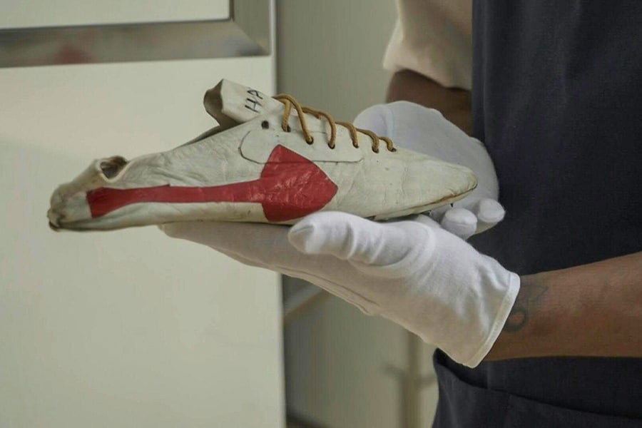 The rare pair of track and field spikes designed by Bill Bowerman for Jerome, a Canadian sprinter who won 100-metre bronze at the 1964 Tokyo Games, features a red arrow that was a prelude to the famous Nike swoosh logo.