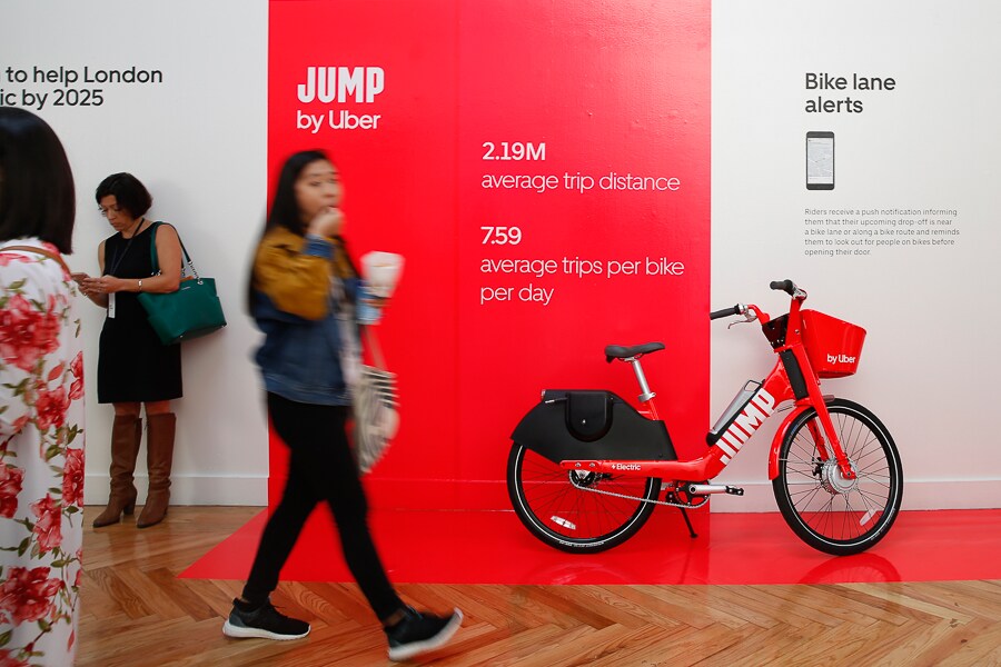 People walk past a JUMP battery-swappable bike on display at an Uber press event on Thursday, September 26, 2019 in San Francisco, CA.