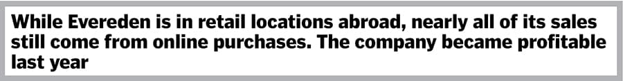 Ho was also naturally conscious of the brand’s presence internationally, given that she originally dreamt up her company after her friends in Malaysia asked her to send clean and safe American products for their newborns. While Evereden is in retail locations abroad, nearly all of its sales still come from online purchases. The company became profitable last year after reaching $100 million in sales.