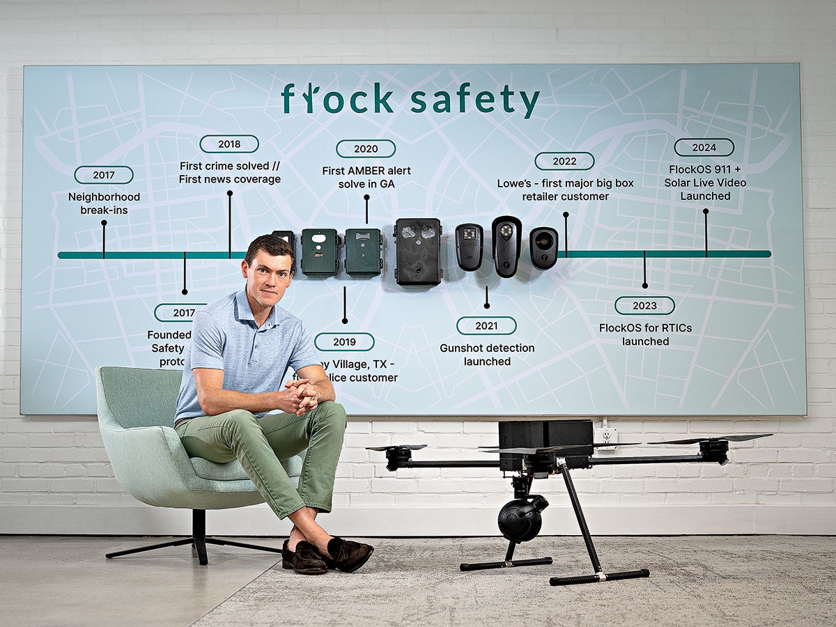 Twenty minutes down the road from Dunwoody, in an office where Flock Safety’s cameras and gunshot detectors are arrayed like museum pieces, 38-year-old CEO and co-founder Garrett Langley presides over the $300 million (estimated 2024 sales) company responsible for it all. Since its founding in 2017, Flock, which was valued at $7.5 billion in its most recent funding round, has quietly built a network of more than 80,000 cameras pointed at highways, thoroughfares and parking lots across the US. They record not just the license plate numbers of the cars that pass them, but their make and distinctive features—broken windows, dings, bumper stickers. Langley estimates its cameras help solve 1 million crimes a year. Soon they’ll help solve even more. In August, Flock’s cameras will take to the skies mounted on its own “made in America” drones. Produced at a factory the company opened earlier this year near its Atlanta offices, they’ll add a new dimension to Flock’s business and aim to challenge Chinese drone giant DJI’s dominance.