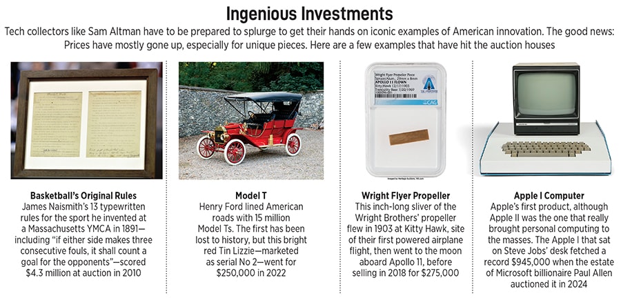 Altman, wearing Adidas Lego Ultraboost sneakers and a simple grey knit sweater, works methodically and chronologically through the artefacts, most of which typically live in his home office, unseen by anyone but his closest friends. On display today, Altman says: A 40,000-year-old hand axe (“an amazing, general-purpose Stone Age tool”), a 3,500-year-old bronze sword (“an interesting example of technology having a big geopolitical impact”) and a compressor fan blade from a Concorde jet engine (“the only piece small enough” to carry in). In casual defiance of museum curator protocol, he has lugged all these items to his office in a duffel bag, individually wrapped in bathroom towels.