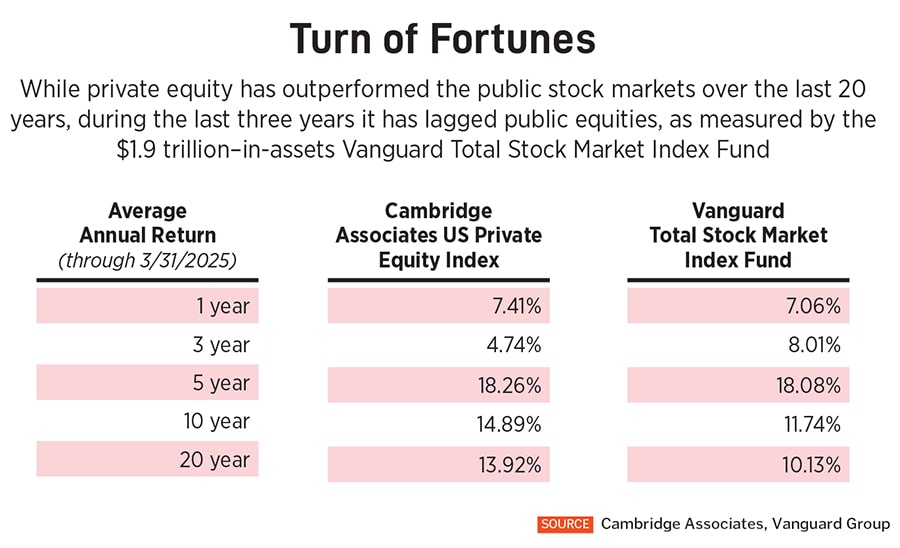 There’s no mystery why private asset managers are keen to play. After years of beating public stock markets, private equity’s average annual return has lagged stocks by more than three points over the last three years. A slowdown of exit deals has led to a glut of aging assets in private equity funds. New funds raised by the industry have plunged 39 percent since 2021 as clients have fewer payouts to reinvest and some college endowments and pension funds are freezing or even reducing their private asset allocations.
