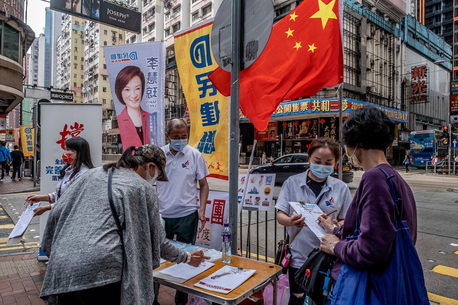 Pro-Beijing activists collect signatures in support of overhauling Hong Kong’s electoral system, March 11, 2021. The very texture of daily life in the vibrant city is under assault as Beijing molds Hong Kong into something more familiar, more docile, with ever more overt signs of its authoritarian will Image: Lam Yik Fei/The New York Times[br]