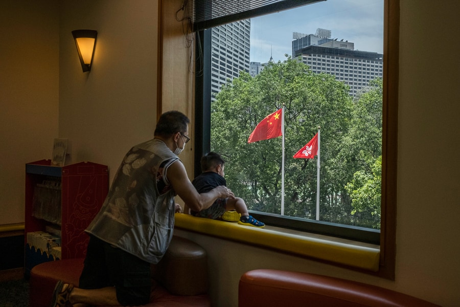 The Flags of China and Hong Kong fly outside the Central Library in Hong Kong, June 8, 2021. Public libraries have removed dozens of books from circulation, including one about the Rev. Dr. Martin Luther King Jr. and Nelson Mandela, as Beijing molds Hong Kong into something more familiar, more docile, with ever more overt signs of its authoritarian will Image: Lam Yik Fei/The New York Times