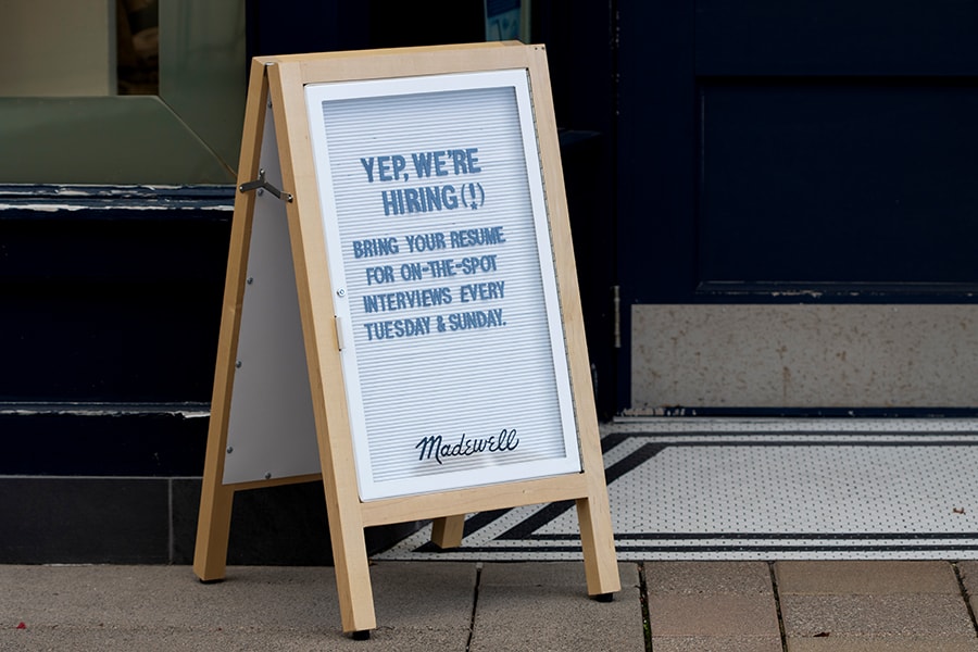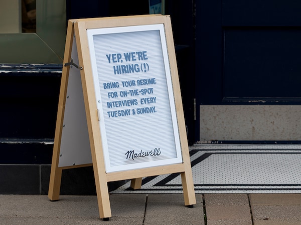 The hiring sign at the entrance to a Madewell retail store in Tigard, Oregon. Workers left their jobs at a record pace in August, led by food and retail industries.